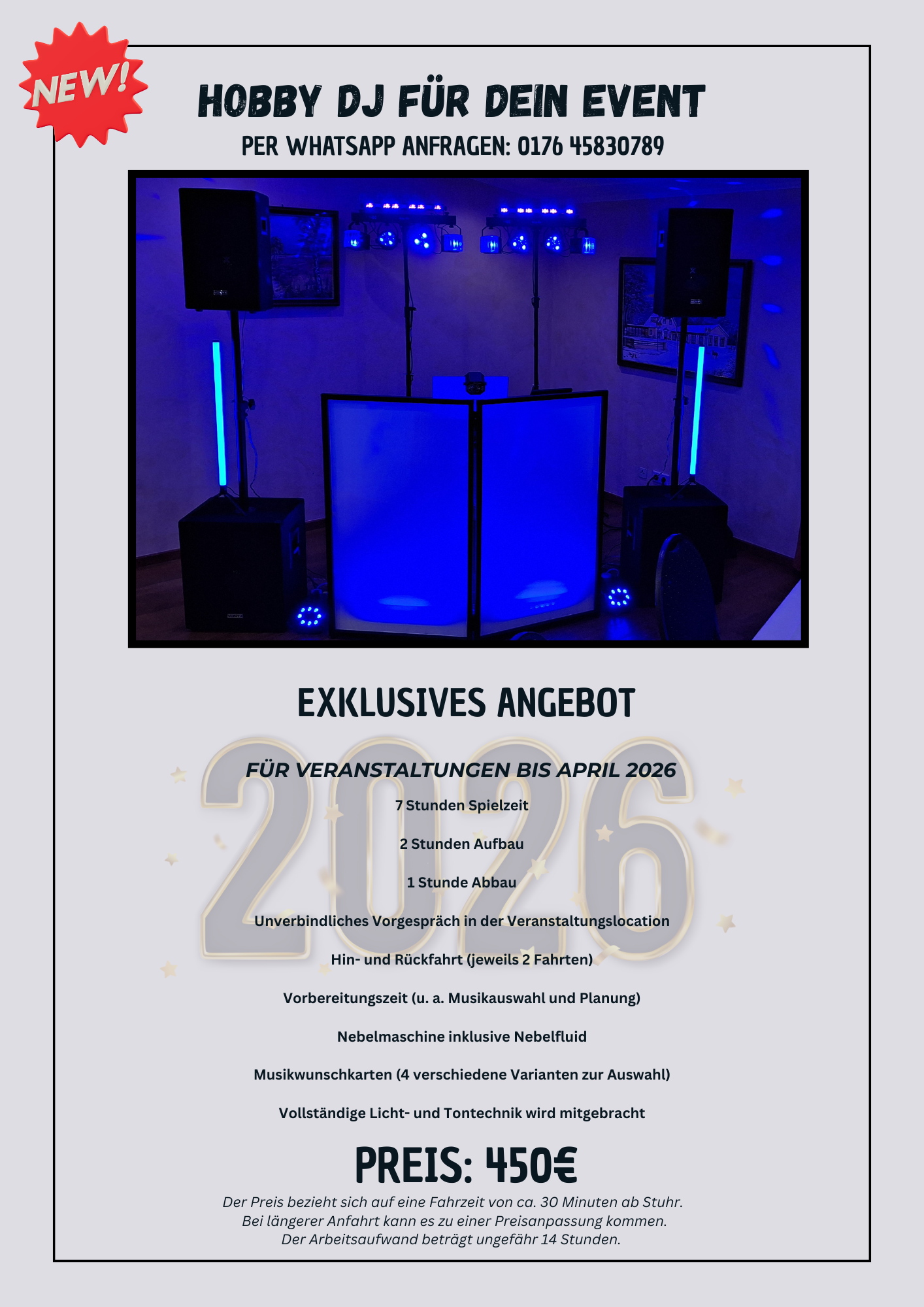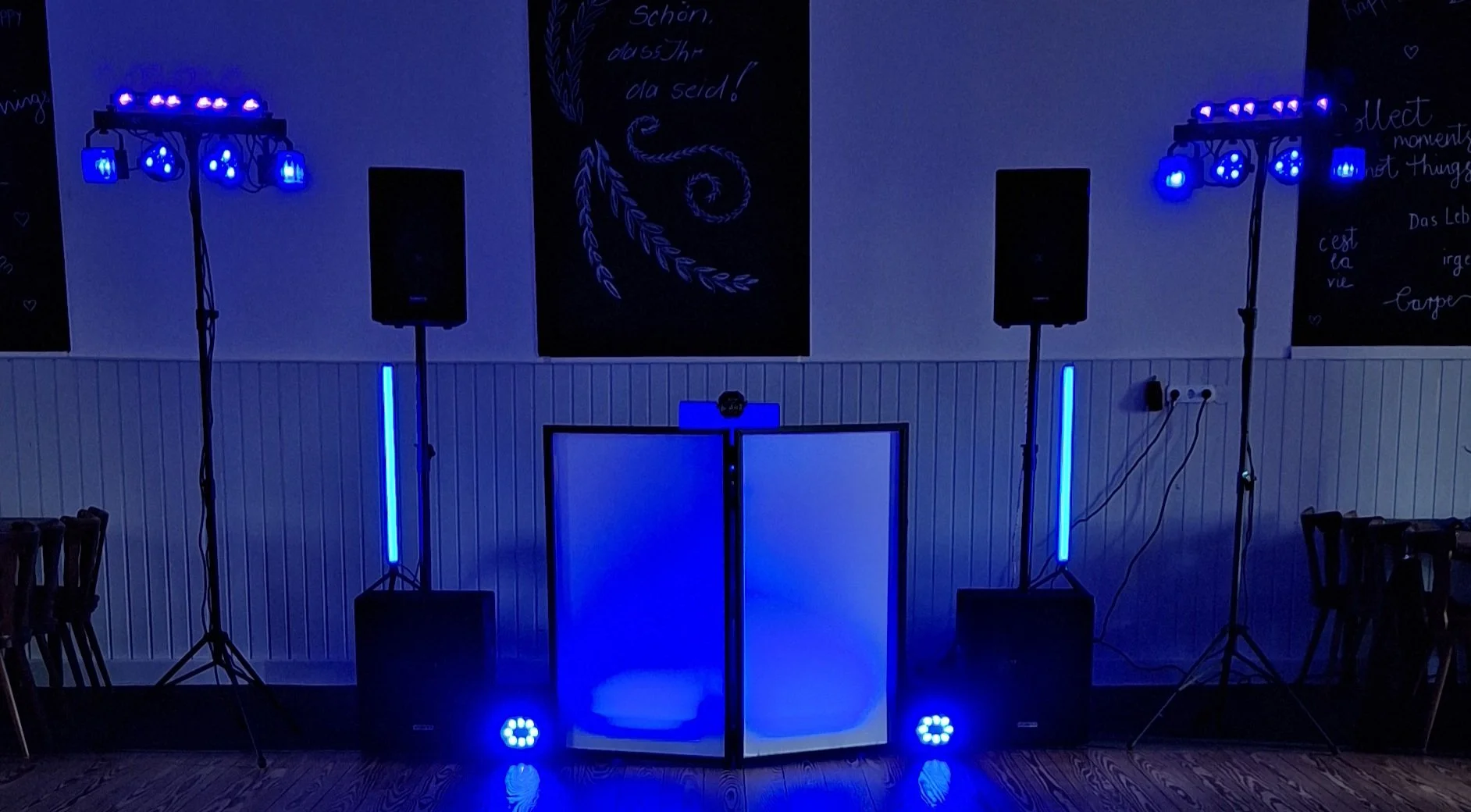 Ich bringe mein eigenes DJ-Equipment mit - darunter ein leistungsstarkes Vonyx-PA-Lautsprecher-Set mit 1700 Watt Gesamtleistung, das für klaren und kraftvollen Sound sorgt. Es besteht aus zwei Subwoofern und zwei Topteilen, die für klare Höhen, druckvolle Mitten und satte Bässe sorgen. Damit ist alles abgedeckt, was ihr für private Feiern mit bis zu 100 Personen braucht! Dazu kommen zwei Lichtstative und zahlreiche Partylichter für die perfekte Stimmung. Zusätzlich biete ich zwei Nebelmaschinen an, die die Lichteffekte eindrucksvoll zur Geltung bringen.